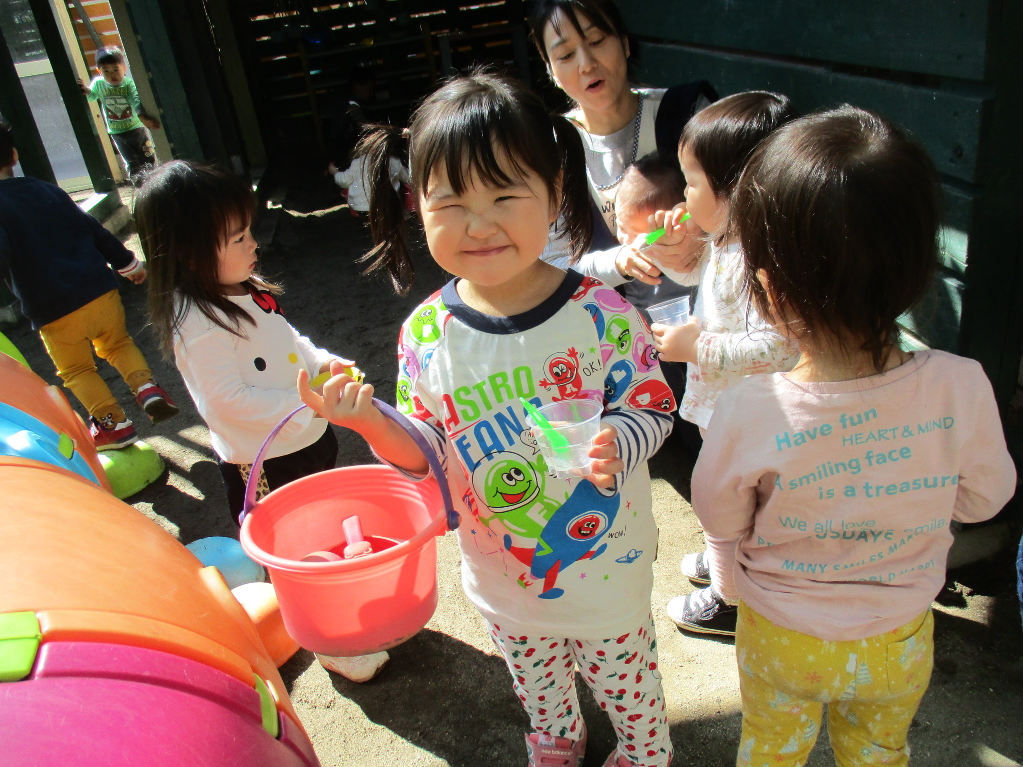 乳幼児期は大地と水と太陽に十分接するあそび、すなわち、水あそび、砂、どろんこあそび、おさんぽを十分に取り入れ、心身共に健康な体づくりと社会性を育みます。